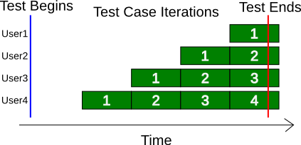 Now that we have the key information we need, how do we put it together? Well, if all the users in a test started at the very beginning and continued to the very end, the calculation is simple: the number of users times the test duration divided by the testcase duration (rounded up) will give you the number of dataset items used.