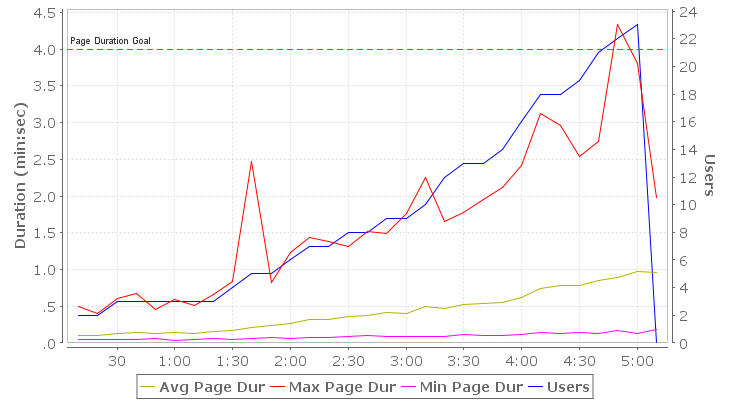 The Page Duration chart shows the minimum, maximum and average page duration for all pages in the test relative to the elapsed test time (sample period) in which they completed. Note that the page duration includes the time required to retrieve all resources for the page from the server. It includes network transmission time but not browser rendering time. In a well-performing system, the page durations should remain below the required limits up to or beyond the required load (number of users), subject to the performance requirements set forth for the system.